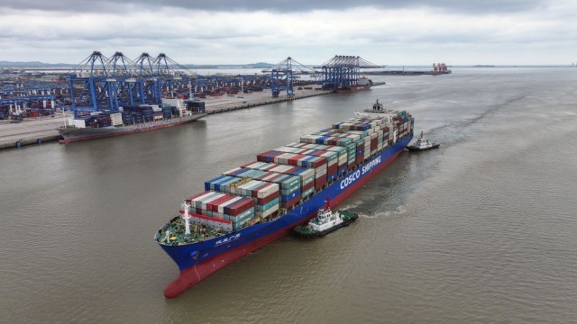 2024年5月19日,一艘海轮在广西钦州港码头靠泊(无人机照片)。钦州港是北部湾港的组成部分,也是中国西南地区通往东盟的重要出海口。西部陆海新通道利用铁路、公路、水运等多种运输方式,由重庆一路向南,经广西北部湾出海通达世界各地。截至2025年1月1日,北部湾港总航线达80条,其中外贸航线49条,基本实现国内主要港口和东南亚、东北亚主要港口全覆盖。