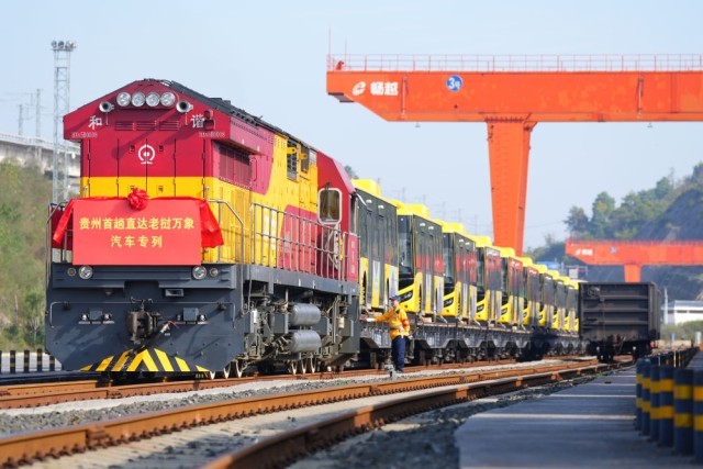 2024年10月28日,装载着28辆“贵州造”新能源客车的出口专列停靠在贵阳国际陆港都拉营站,准备经由云南磨憨口岸出境前往老挝万象。这是贵州的中老班列首次整列直发,也是贵州本土生产的新能源客车首次出口老挝。