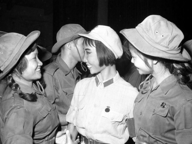 1967年6月30日,越南南方解放军歌舞团的演员在北京观看芭蕾舞剧《红色娘子军》。这是中越两国演员在一起交谈。