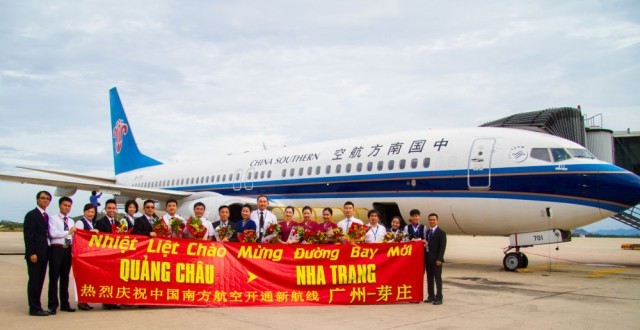 2015年6月20日,中国南航广州至越南芽庄首航成功,机组人员在抵达越南金兰国际机场后合影。