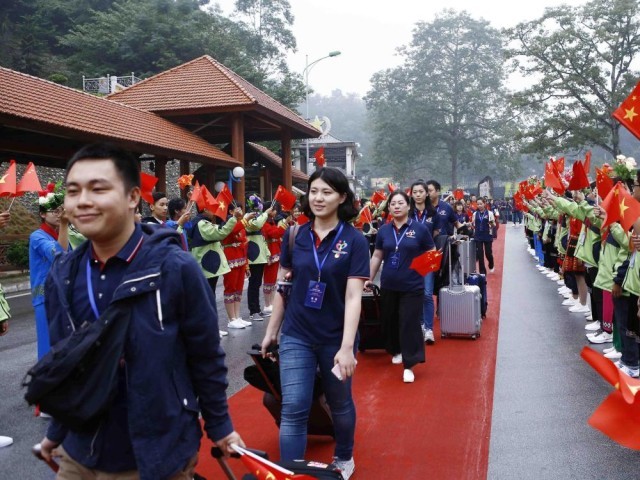 2016年11月7日,在越南北部谅山省,人们欢迎中国青年代表参加第三届中越青年大联欢。