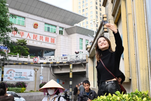 2025年1月8日,游客在与越南芒街市隔河相望的广西东兴口岸附近拍照打卡。