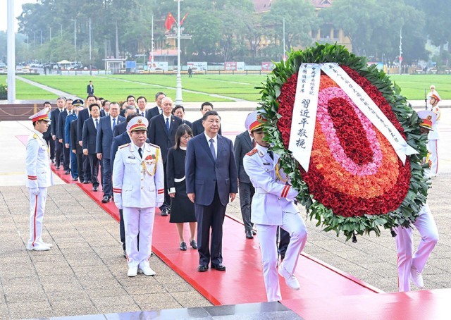 当地时间2023年12月13日上午,中共中央总书记、国家主席习近平在河内瞻仰胡志明陵并敬献花圈。 新华社记者 申宏 摄