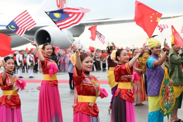 马来西亚儿童向习近平献花,马来西亚青少年表演富有当地特色的舞蹈,挥舞中马两国国旗,热烈欢迎习近平到访。