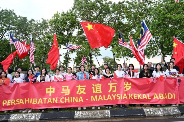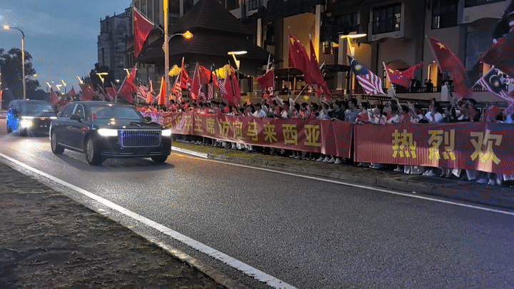 习近平乘车从机场赴下榻饭店途中,当地中资企业人员、留学生在道路两旁挥舞中马两国国旗,高举“热烈欢迎习近平主席访问马来西亚”、“中马友谊万岁”等红色横幅,华侨华人表演喜庆热烈的舞狮,欢迎习近平到访。