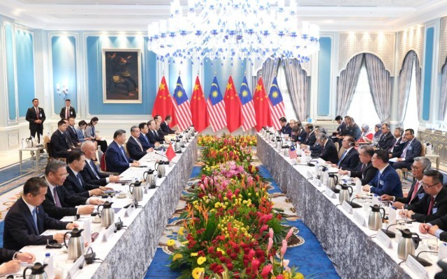 4月16日下午,习近平同马来西亚总理安瓦尔在布特拉加亚总理官邸举行会谈。