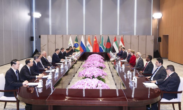 习近平指出,全球南方群体性崛起,成为维护世界和平、促进共同发展、完善全球治理的重要力量。无论国际形势如何变化,人类发展进步的大方向不会改变。中国发展靠的是自力更生、艰苦奋斗,将坚定维护自身正当权益和国际社会共同利益。