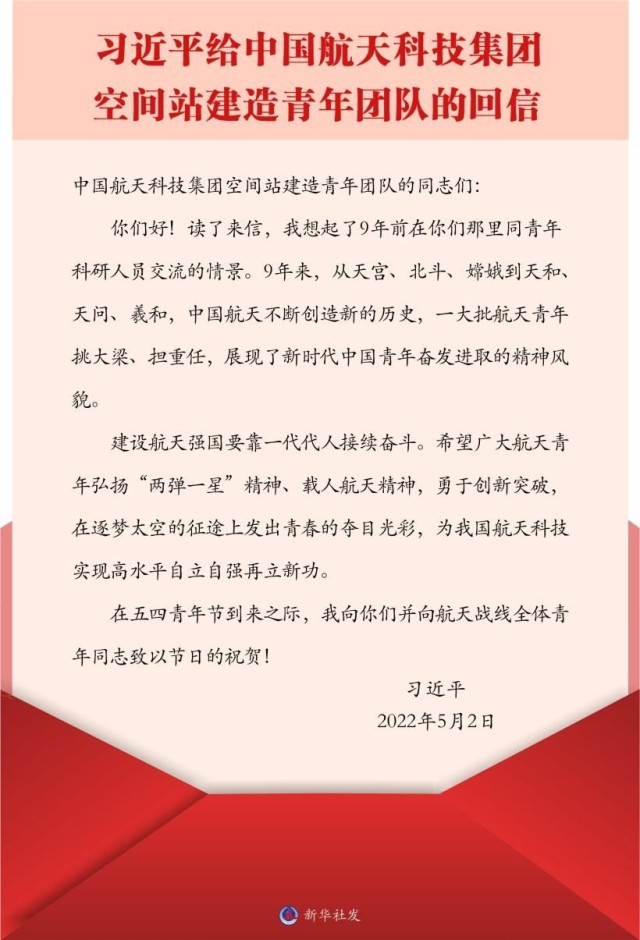 习近平总书记给中国航天科技集团空间站建造青年团队的回信。新华社发