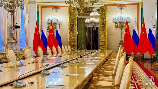 △习主席和普京总统举行大范围会谈的会场。(总台央视记者赵东辰拍摄)