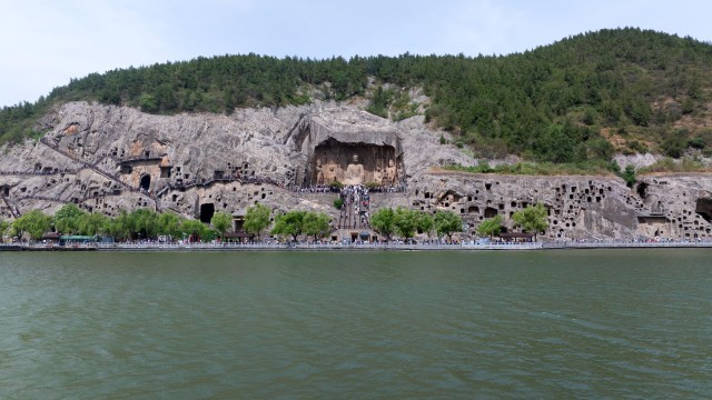 △伊水河畔的龙门石窟。(总台央视记者范凯、姜新刚拍摄)