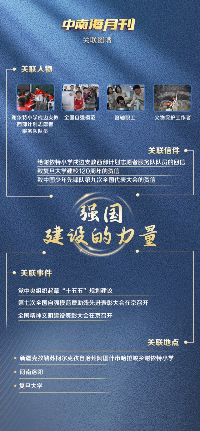青年是强国建设的先锋队、突击队。给谢依特小学戍边支教西部计划志愿者服务队队员回信,总书记为他们点赞,并鼓励广大青年“厚植家国情怀,练就过硬本领”,“为中国式现代化建设贡献青春力量”;致信祝贺复旦大学建校120周年,总书记希望复旦大学“深化教育科研改革,推动科技自主创新和人才自主培养良性互动”,不断提升服务国家重大战略和区域经济社会发展能力。
