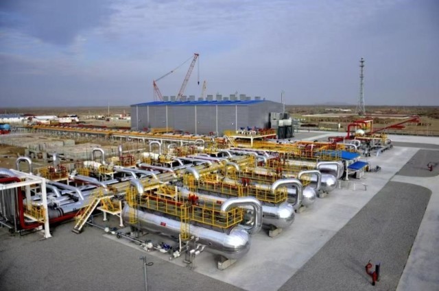 在土库曼斯坦卡拉库姆沙漠深处的阿姆河右岸气田,集气站高高耸立,输气管道纵横交错——这里是中国—中亚天然气管道的重要气源地。