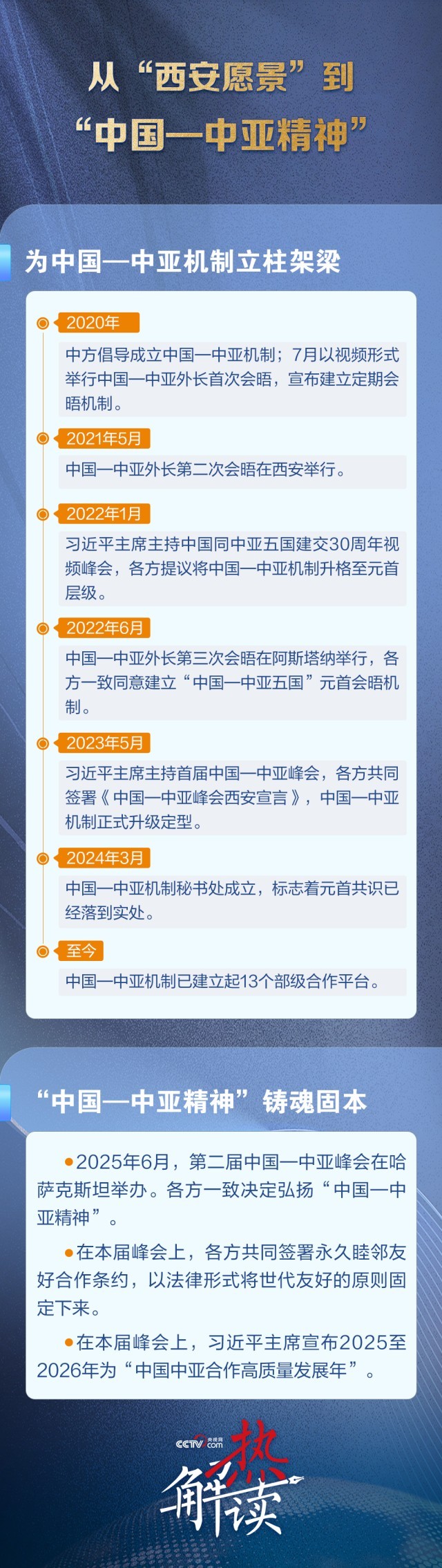 热解读当地时间6月17日,习近平主席在哈萨克斯坦首都阿斯塔纳出席第二届中国—中亚峰会并作主旨发言,首次提出“中国—中亚精神”。