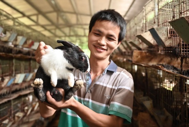 涂银春在展示他养殖的兔子(2020年8月21日摄)。涂银春曾是福建省长汀县涂坊镇的建档立卡贫困户。他2013年开始试养兔子,2016年在镇村干部鼓励和支持下参加专业技能培训,并通过小额信贷扩大生产,成功脱贫。新华社记者 林善传 摄