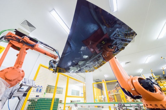 在福耀集团的汽车玻璃绿色智慧工厂中,由大数据赋能的生产线上,人工智能机械手组群正灵动准确地互相配合,高效生产着时尚智能化的汽车玻璃产品。