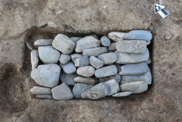 随着工作的推进,考古人员又在月亮湾小城东南部的燕家院子地点发现了一处人工堆筑的土台。“土台面积超过6000平方米,采用了斜坡堆筑的建筑方式,与月亮湾小城东城墙等基本一致。”乔钢介绍,尤其值得一提的是,燕家院子人工土台初步判断为多级土台,最上层土台上还发现了一处大型房屋建筑基址,面积超过200平方米,并且外围可能存在回廊。这处建筑基址的最大单间,目前已揭露了90多平方米。房屋基槽内的填充物则全是陶“板状器”,可以看出大多经过火烧、直立插入基槽,或许代表了木骨泥墙以外的砌墙工艺的出现。