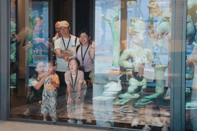 近年来,向世界讲好三星堆的故事、展示中华文明的多元一体和底蕴深厚、持续擦亮三星堆文化名片,也是三星堆的重中之重。对内,三星堆博物馆不断创新展陈。记者在三星堆博物馆互动体验厅看到,观众可以通过互动装置“穿越”回古蜀国,沉浸式体验三星堆先民的衣食住行、生产生活、精神世界。对外,三星堆借助文物复制品、数字技术等手段,不断在海外擦亮中国文化名片,打造具有中国气度、国际形象的超级文化符号。