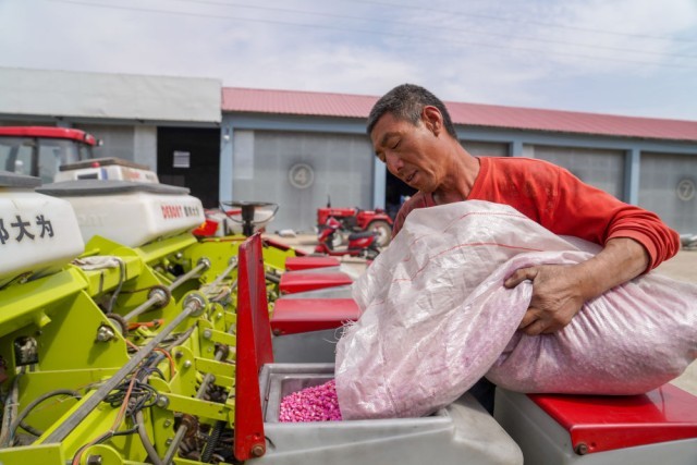 2020年5月7日,在吉林省四平市梨树县康达农机农民专业合作社,农民向免耕播种机里投放玉米种子。