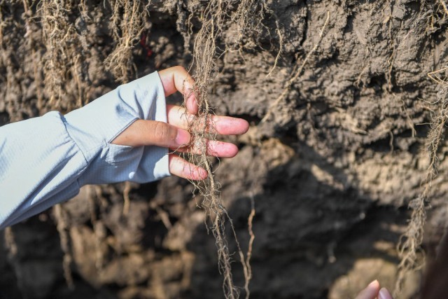 2023年7月31日,在位于吉林省四平市梨树县的中国农业大学“科技小院”保护性耕作试验田,一名学生查看玉米根部在黑土中的生长情况。