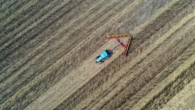 2024年4月2日,农民在吉林省公主岭市范家屯镇驾驶农机整理耕地里的秸秆(无人机照片)。