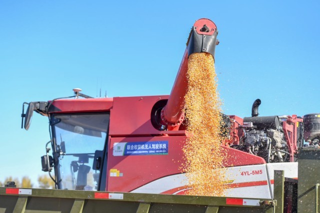 2023年10月19日,在中国科学院“黑土粮仓”科技会战长春示范区公主岭示范基地,无人驾驶农机将收获的玉米装车。