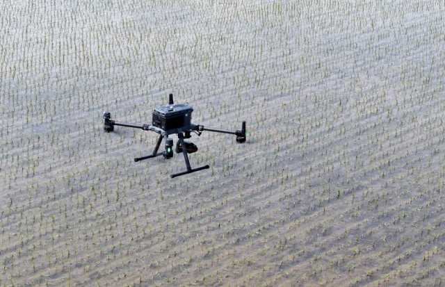 2025年5月21日,在黑龙江省北大荒农业股份八五六分公司第六管理区农业现代化示范区,搭载多光谱、可见光摄像头的无人机对水稻插秧后田块进行土壤墒情监测(无人机照片)。