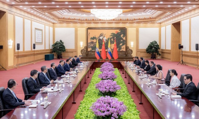 6月27日上午,国家主席习近平在北京人民大会堂会见来华出席夏季达沃斯论坛的厄瓜多尔总统诺沃亚。新华社记者 翟健岚 摄