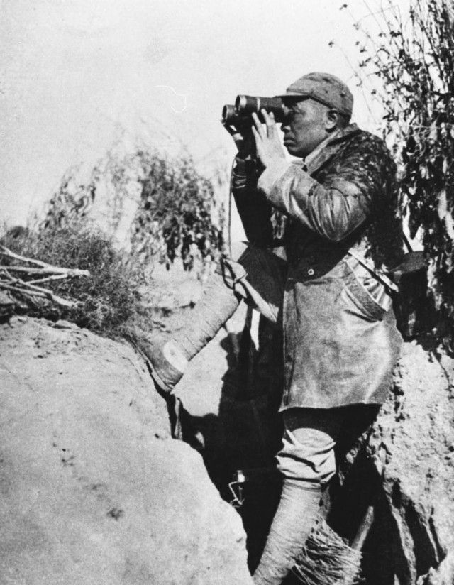百团大战,是抗日战争中八路军在华北地区发动的一次规模最大、持续时间最长的进攻战役,先后有105个团约20余万人参加,仅前3个半月,就作战1824次,毙伤日、伪军2.58万人,俘虏1.8万余人。这是彭德怀身处前线指挥百团大战(中国照片档案馆馆藏)。