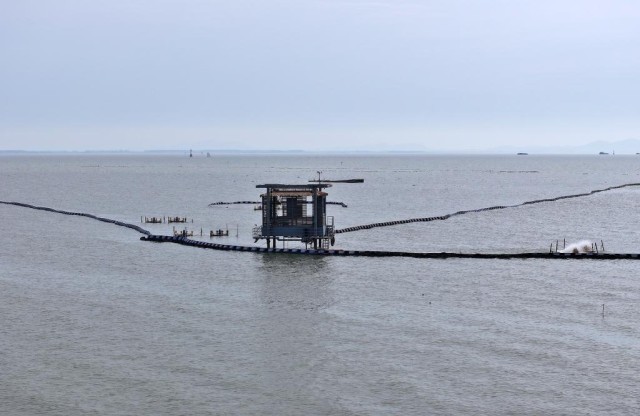 8月9日,在安徽省合肥市肥西县严店镇巢湖岸边拍摄的深井控藻平台及周边围隔(无人机照片)。(徐勇 摄)