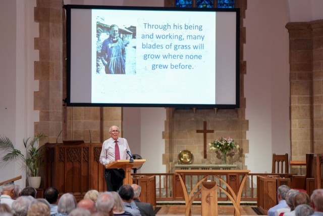 7月22日,在英国赫特福德郡哈彭登镇,乔治·艾尔温·何克的外甥马克·艾尔温·托马斯在纪念活动上发表演讲。新华社记者 吴鲁 摄