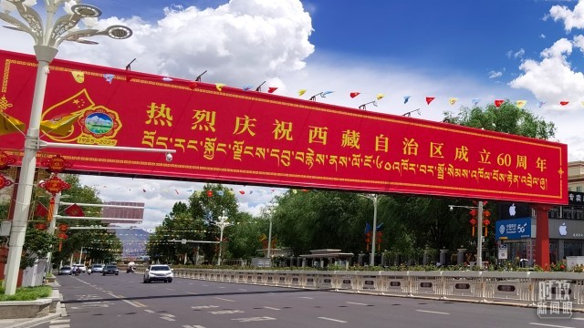 △拉萨街头庆祝西藏自治区成立60周年的巨型横幅。(总台央视记者曹亚星拍摄)