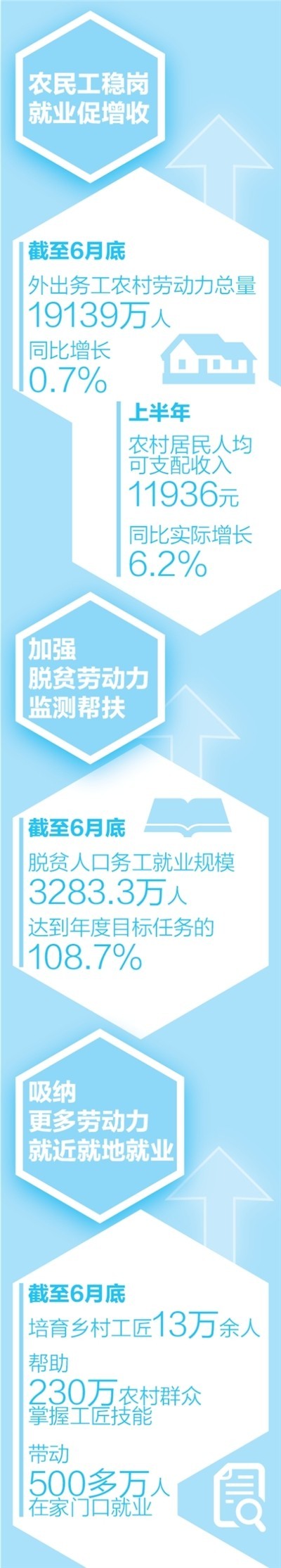 今年受内外部经济形势影响,农民工就业增收面临不少困难挑战。广大企业顶住压力积极作为,闯市场稳订单,吸纳更多就业;各地区各部门千方百计拓宽就业渠道,提升农民工技能水平。二季度末,外出务工农村劳动力达1.91亿人,同比增长0.7%;上半年,农村居民人均可支配收入11936元,扣除价格因素实际增长6.2%,高于城镇居民收入增速。
