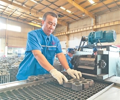 【镜头】在甘肃定西安定区的定西高强度紧固件股份有限公司车间里,负责质量检测的邢亚军仔细检查拳头大小的六角螺母。