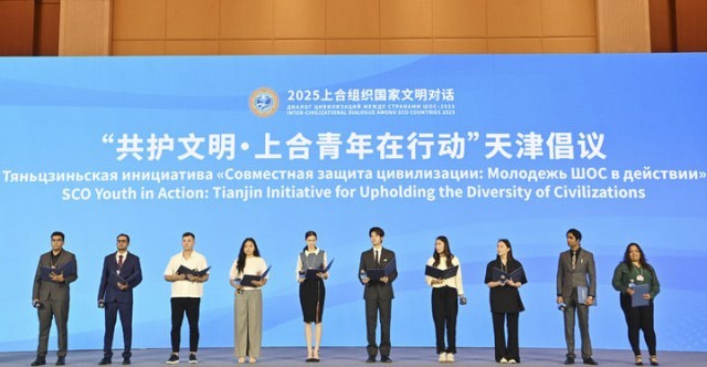 这是在2025上合组织国家文明对话现场拍摄的“共护文明·上合青年在行动”天津倡议发布环节(2025年7月23日摄)。