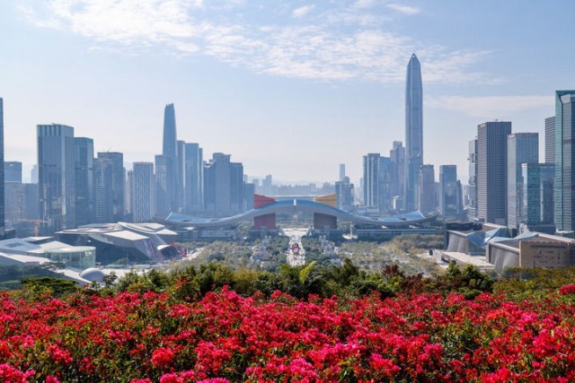 从深圳莲花山山顶俯瞰城市中轴线(2025年1月29日摄)。新华社记者 梁旭 摄