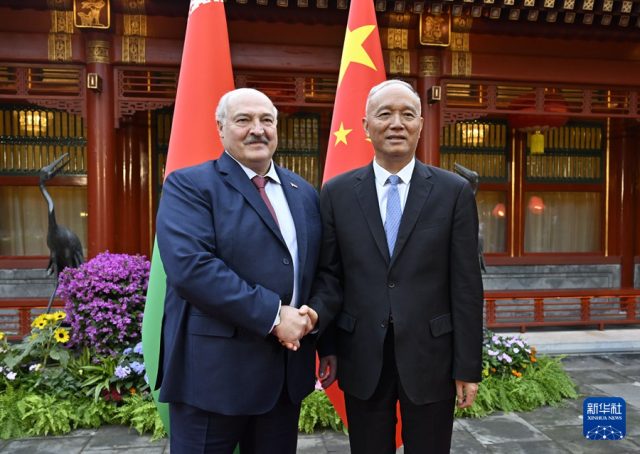 9月2日,中共中央政治局常委、中央书记处书记蔡奇在北京会见来华出席2025年上海合作组织峰会和纪念中国人民抗日战争暨世界反法西斯战争胜利80周年活动的白俄罗斯总统卢卡申科。新华社记者 殷博古 摄