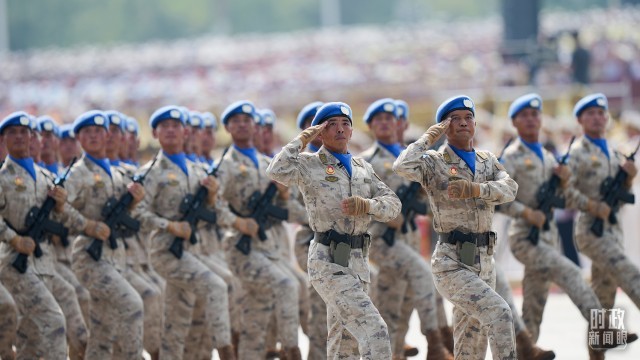 阅兵式上,维和部队方队阔步走来。今年是中国军队参加联合国维和行动35周年,累计派遣超过5万名维和官兵,中国是联合国安理会常任理事国中派出维和人员最多的国家。“中国蓝盔”不惧艰险、不辱使命,以热血锻铸和平盾牌,用行动谱写大国担当,已经成为守护世界和平安宁的关键稳定力量。