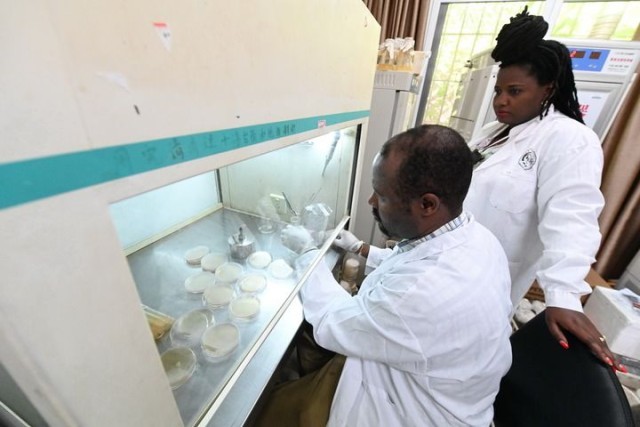 2024年8月30日,卢旺达菌草项目协调员梅迪(右)和她的丈夫马文博在福建农林大学国际菌草工程技术研究中心实验室开展菌种分离实验工作。新华社记者 林善传 摄