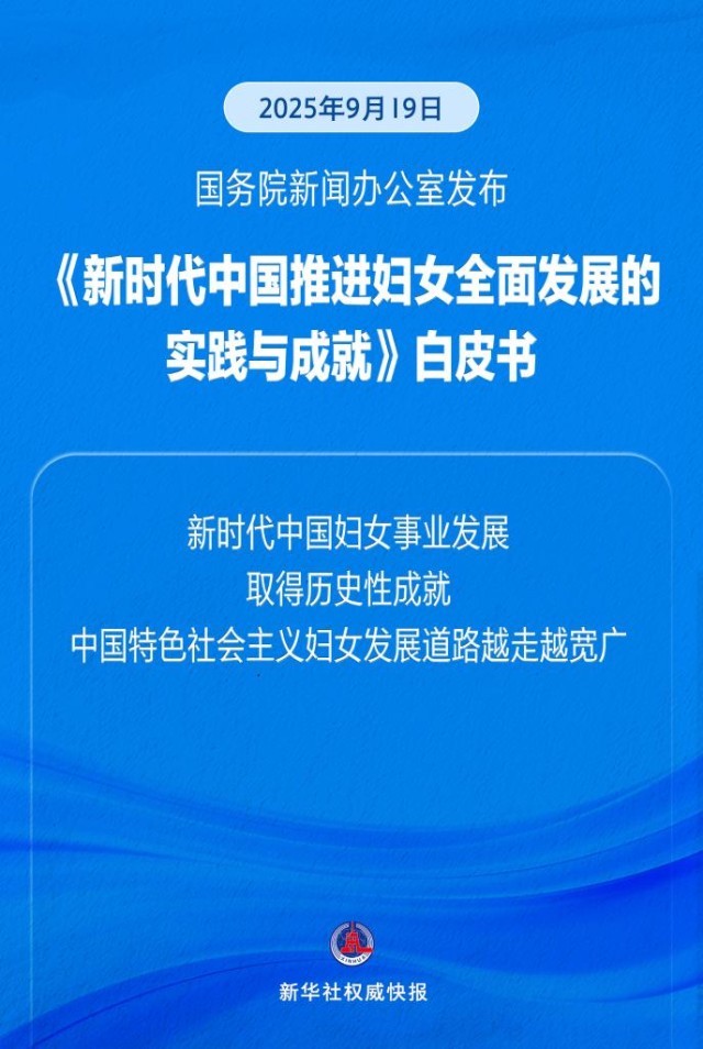 新华社北京9月19日电(记者董博婷、孙少龙)国务院新闻办公室19日发布《新时代中国推进妇女全面发展的实践与成就》白皮书。