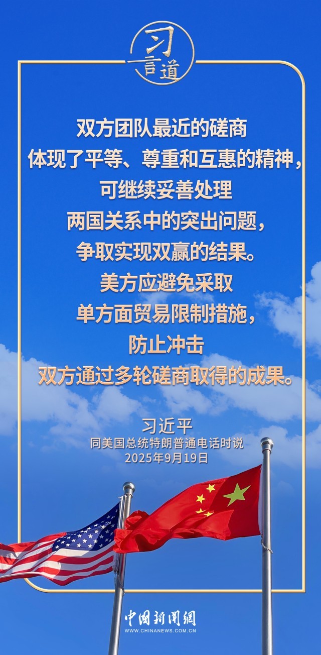 9月19日,国家主席习近平同美国总统特朗普通电话,就当前中美关系和共同关心的问题坦诚深入交换意见,就下阶段中美关系稳定发展作出战略指引。习近平指出——