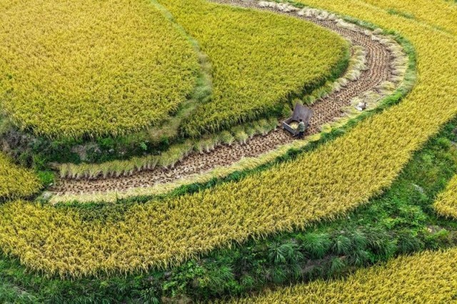△2025年9月18日,稻农在重庆黔江区五里镇的稻田里抢收稻谷。