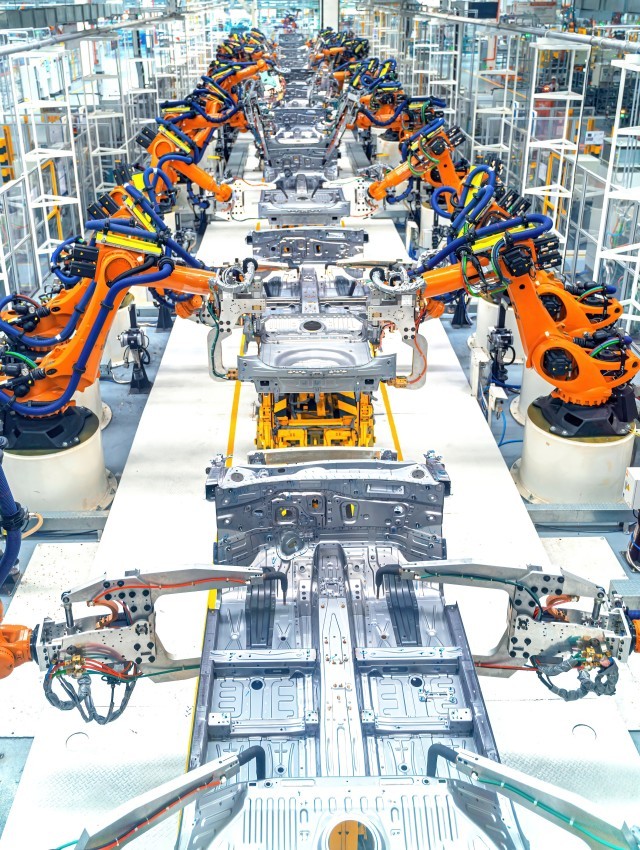 △ 现代化的汽车制造厂焊接装配线。(图/视觉中国)