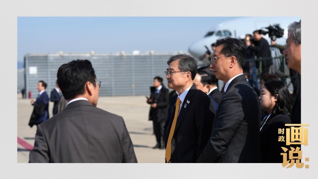 △韩国外交部长赵显在釜山金海国际机场热情迎接习近平主席