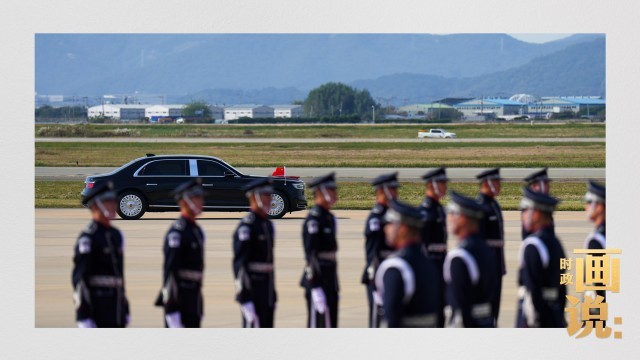 习近平抵达釜山金海国际机场时,韩国外长赵显等高级官员热情迎接。礼兵分列红地毯两侧致敬,军乐团演奏行进乐,机场鸣放21响礼炮。