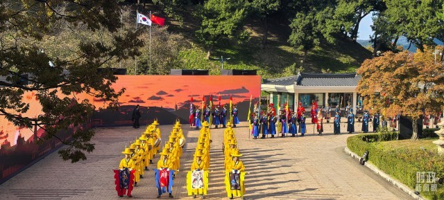 在庆州博物馆的千年微笑馆,李在明总统为习主席举行高规格欢迎仪式,身着传统民族服饰的韩国礼仪队,隆重欢迎习主席到来。