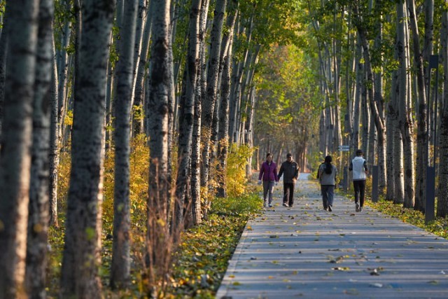市民在北京市朝阳区的朝阳绿道上散步休闲(2025年11月14日摄)。新华社记者 鞠焕宗 摄