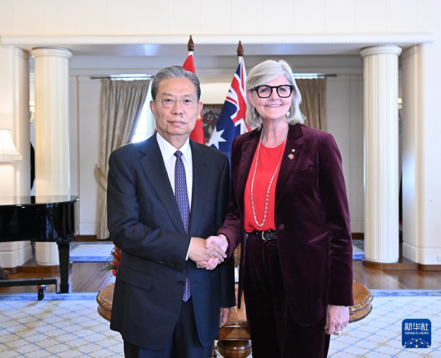 应澳大利亚联邦议会参议长莱恩斯和众议长迪克邀请,全国人大常委会委员长赵乐际11月22日至25日对澳大利亚进行正式友好访问。这是11月24日,赵乐际在堪培拉会见澳大利亚总督莫斯廷。新华社记者 李响 摄