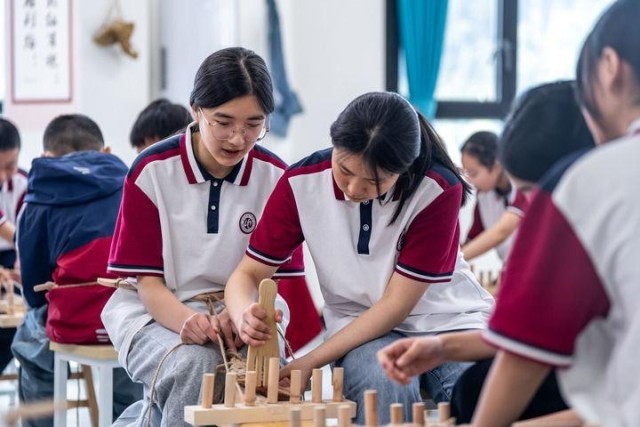 △2025年5月12日,云南威信县第一中学的学生在红色研学教育基地体验编织草鞋。