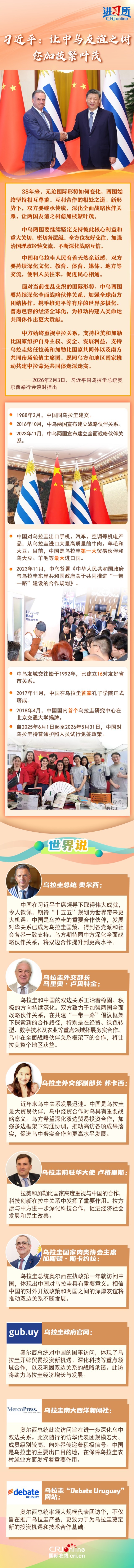 2月3日,中国国家主席习近平在北京同来华进行国事访问的乌拉圭总统奥尔西举行会谈。习近平指出,中乌两国虽然远隔重洋,但双方理念相近、友谊深厚,是隔海相望的好邻居、好伙伴。新形势下,双方要继承传统,深化全面战略伙伴关系,让两国友谊之树愈加枝繁叶茂。
