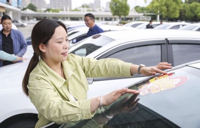 2023年高考期间,江苏省淮安市开展“爱心送考”志愿者服务活动,组织爱心司机在高考期间为考生提供送考服务。这是淮安市一名网约车司机在车辆上张贴“爱心送考”标识。
